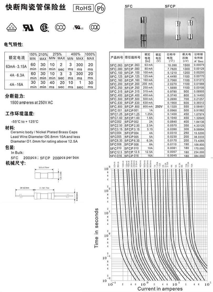5.2x20mm陶瓷管快斷保險絲