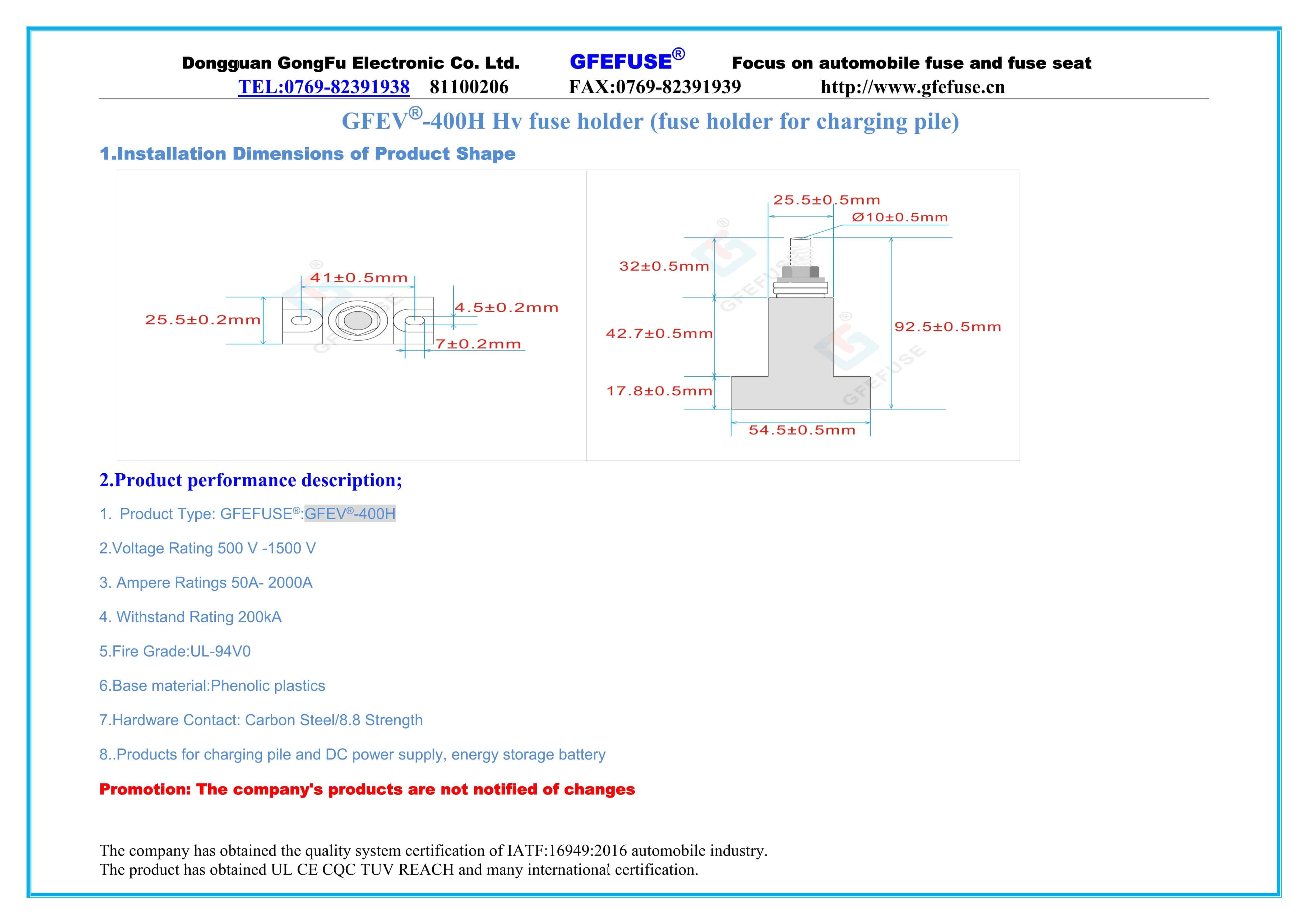 東莞市貢福電子有限公司專業(yè)制造銷售太陽能光伏熔斷器、新能源車用保險絲、微型保險絲、叉栓保險絲、汽車保險絲、高壓保險絲、貼片保險絲、陶瓷保險絲、汽車保險絲座、汽車熔斷器、突跳式溫控器、汽車過載保護器,保險絲座,汽車插片保險絲。插片保險絲座,叉栓保險絲座,叉栓保險絲盒,螺栓保險絲,螺栓保險絲座,低壓熔斷器.直流熔斷器,直流保險絲,車用保險絲,車用保險絲座等。產(chǎn)品通過UL CE CQC TUV REACH等認證。客戶遍布廣東、江蘇、東莞、上海等全國各地。